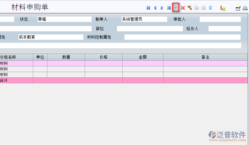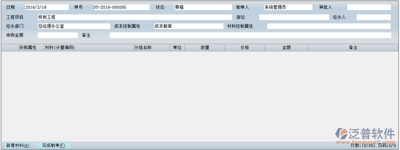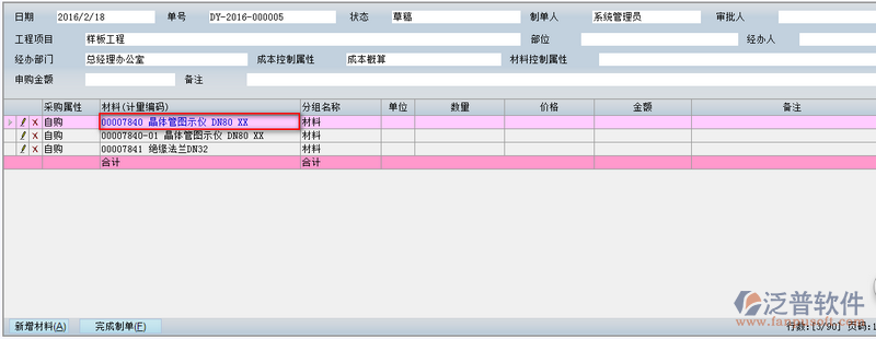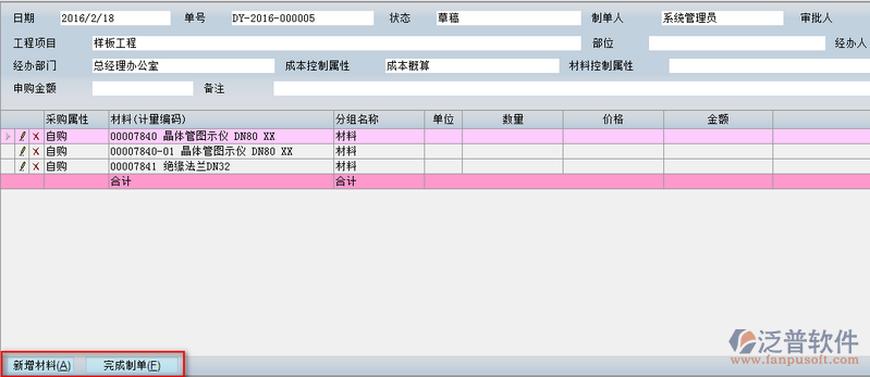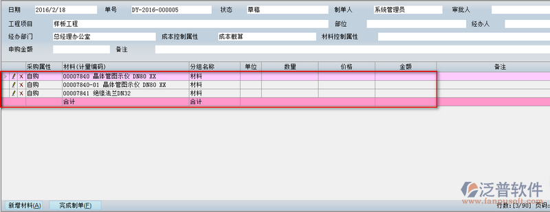 填寫完需求計劃中的相關(guān)信息,其中屬性主要包括:工程項目名稱、材料控制屬性、申購金額、部門等相關(guān)信息。如圖: