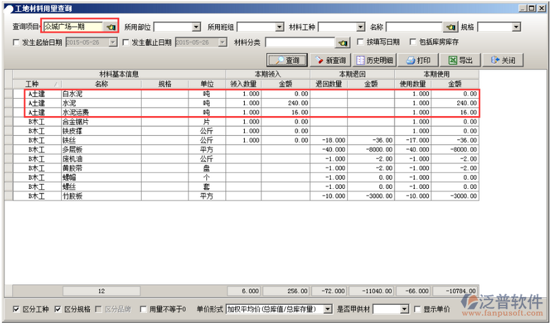 直進(jìn)項(xiàng)目的材料在單據(jù)添加保存完成后體現(xiàn)在“材料用量查詢”里面,如圖: