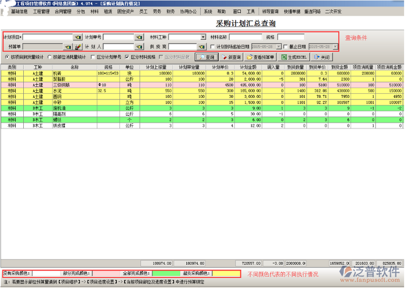 如果要查看材料采購(gòu)的執(zhí)行情況,可進(jìn)入到[采購(gòu)計(jì)劃執(zhí)行查詢(xún)]里面按照查詢(xún)條件進(jìn)行查詢(xún)??筛鶕?jù)材料顯示的不同的顏色看出材料的采購(gòu)計(jì)劃執(zhí)行情況,如圖: