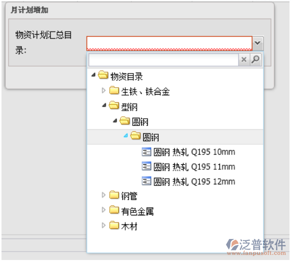 點(diǎn)擊“物資計(jì)劃匯總目錄”的下拉框,下拉列表中列出的是本項(xiàng)目部已有物資總計(jì)劃的物資匯總列表,如下圖所示: