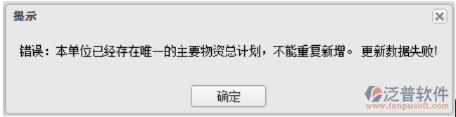 注意:每個項目只能有一個主要物資總計劃,所以,如果項目部已經(jīng)有主要物資總計劃了,再發(fā)起第二個物資總計劃,就會在加載“主要物資總量計劃表”時,彈出以下的信息提示框: