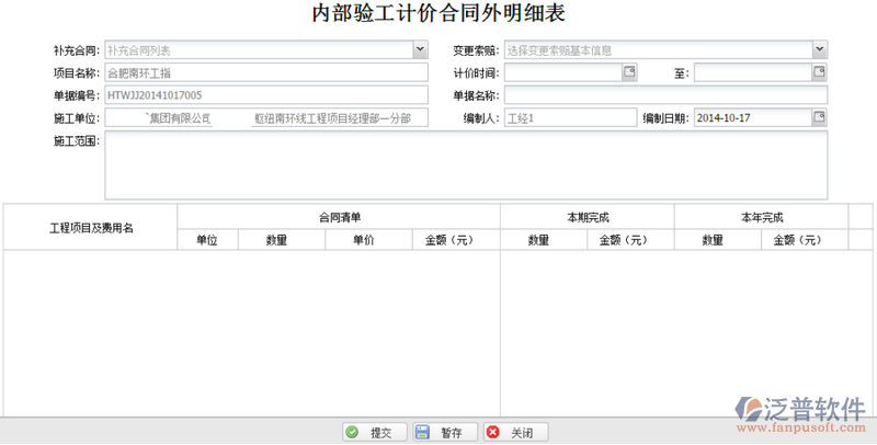 內(nèi)部驗工計價僅局(代)指項目使用,由內(nèi)部合同內(nèi)驗工計價明細表、內(nèi)部合同外驗工計價明細表、內(nèi)部其他費用明細表和內(nèi)部驗工計價匯總表四部分組成,只需填入本期完成的數(shù)量,其余字段都可自動計算。
