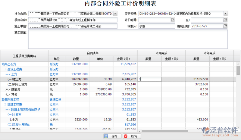 然后為其輸入數(shù)值后,鼠標焦點離開當前編輯框,點擊【保存】按鈕,即可成功填寫并保存本期計價信息。數(shù)據(jù)來源及填寫說明如下: