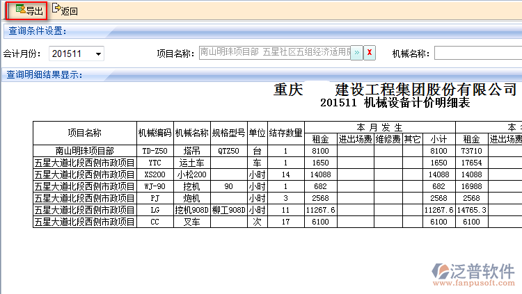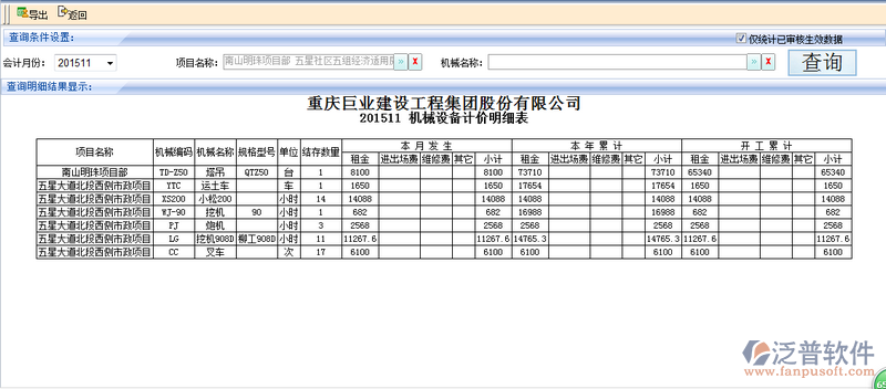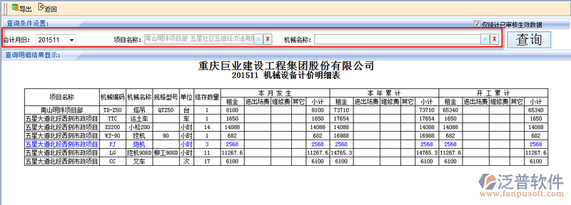 2、用戶可通過【會(huì)計(jì)月份】、【項(xiàng)目名稱】以及【機(jī)械名稱】進(jìn)行相關(guān)機(jī)械的計(jì)價(jià)明細(xì)查。如圖: