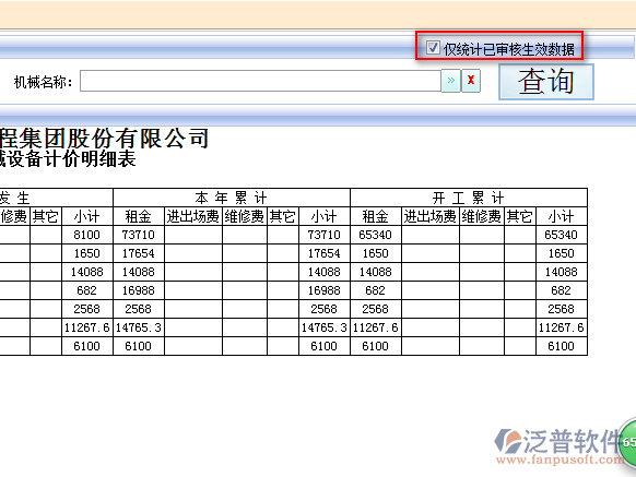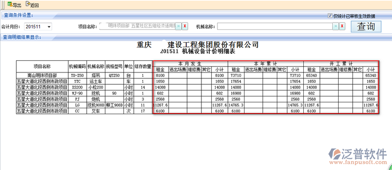 3、查詢出的機(jī)械明細(xì)信息可詳細(xì)看到機(jī)械【本月發(fā)生金額】、【本年累計(jì)金額】以及【開工累計(jì)】等相關(guān)信息。如圖: