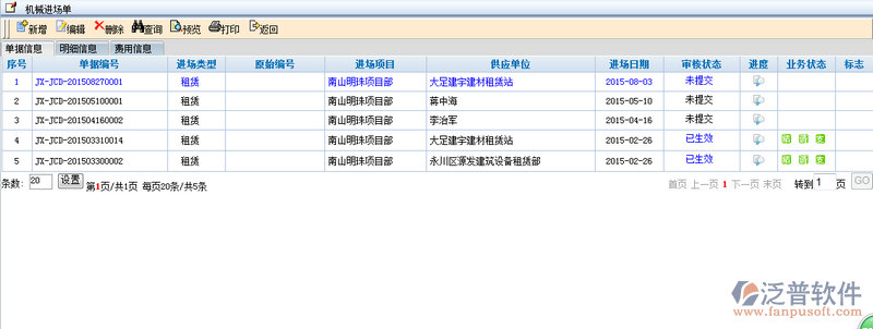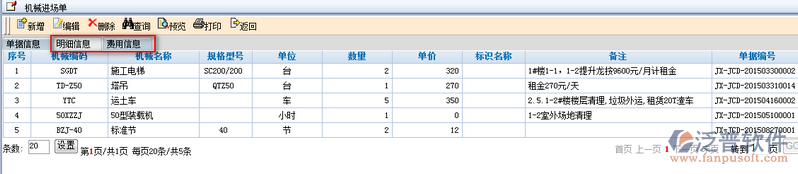 4、創(chuàng)建好的機械進場單點擊【明細信息】便可查看到所有對應(yīng)進場單詳細信息和費用信息。如圖: