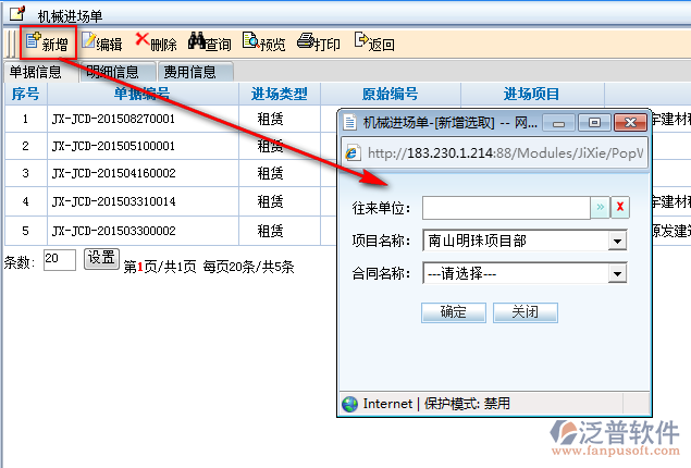 2、點擊主界面中【新增】即可進入機械進場單新增頁面,如圖: