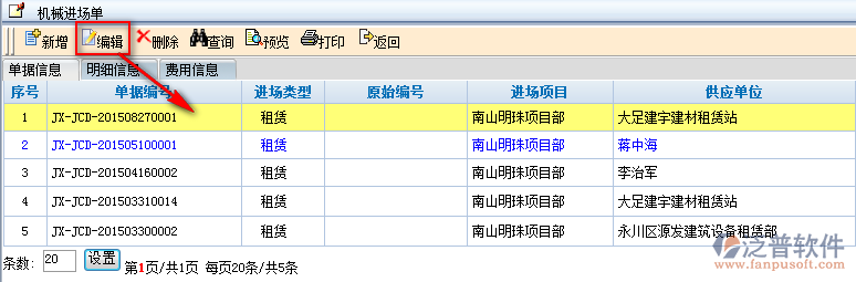 3、創(chuàng)建好的機械進場單可直接選中需要修改的進場單點擊【編輯】即可進入修改頁面。如圖: