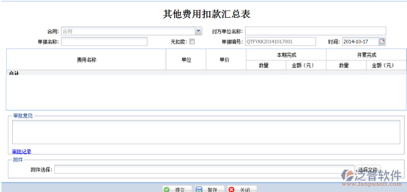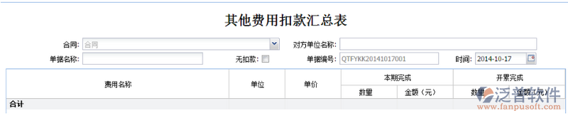 點擊功能菜單【成本管理—勞務管理—勞務結(jié)算—其他費用扣款單】,成功發(fā)起【其他費用扣款匯總表】流程后,加載出“其他費用扣款匯總表”表單,如下圖所示: