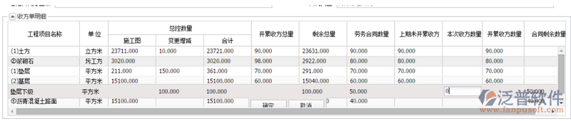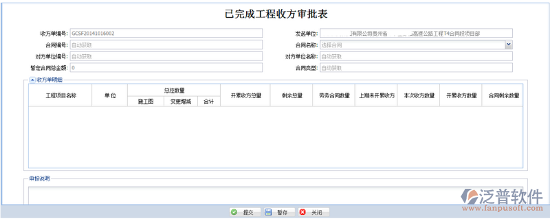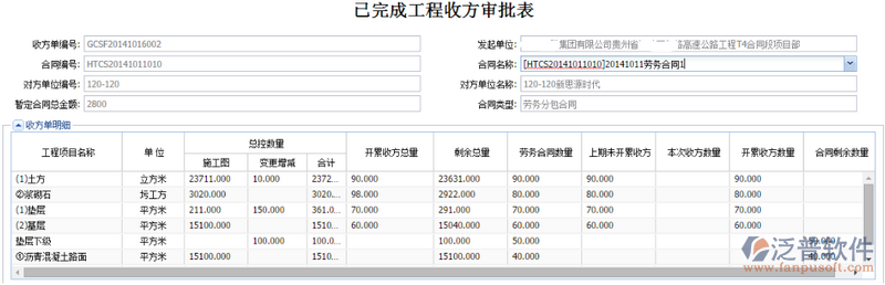 收方單明細(xì):選擇合同后,自動(dòng)加載出合同里面的勞務(wù)和工程細(xì)目;