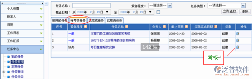 列出所有“考核人”是我、任務(wù)負(fù)責(zé)人匯報(bào)已經(jīng)完成100%的任務(wù)。在這里,我可以對(duì)這些任務(wù)進(jìn)行考核確認(rèn)。在“待考核任務(wù)”列表中,操作欄有考核按鈕