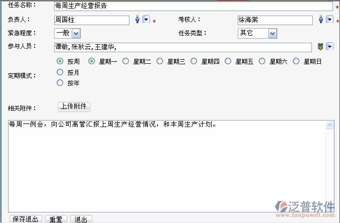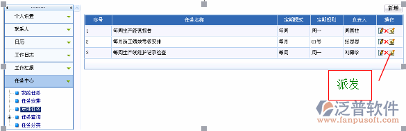 這里需要特別說(shuō)明的是:和日程安排不同,“定期事件”設(shè)置好之后,會(huì)自動(dòng)定期提醒。而定期任務(wù)是需要每次派發(fā)的,即只是為了減少每次新增同樣任務(wù)的麻煩。派發(fā)一次,相關(guān)人員就收到這個(gè)新任務(wù);第二次派發(fā),相關(guān)人員就再次收到新任務(wù);如果不派發(fā),相關(guān)人員就不能收到這個(gè)任務(wù)。