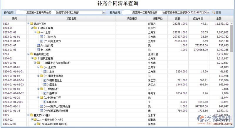 選擇一個(gè)補(bǔ)充合同后,點(diǎn)擊【查詢(xún)】按鈕,即可查詢(xún)?cè)撗a(bǔ)充合同的清單。如下圖: