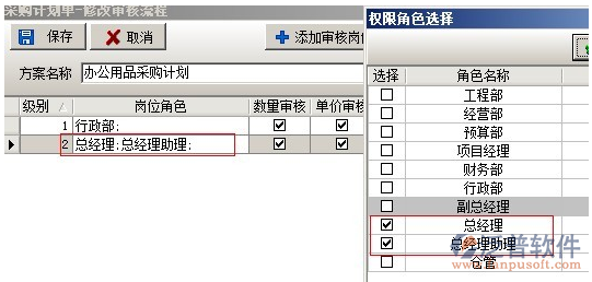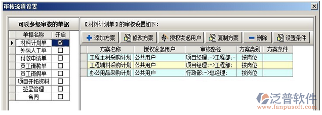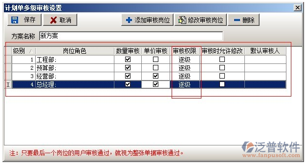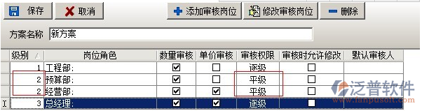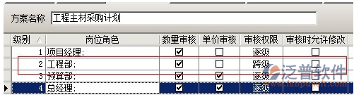 在多級(jí)審核中,可以設(shè)置多套審核方案,每套方案可設(shè)置多個(gè)崗位,可設(shè)置方案的授權(quán)發(fā)起用戶(在業(yè)務(wù)單據(jù)中選擇該審核方案的用戶)。在添加方案時(shí),有三種方式逐級(jí)審核、平級(jí)審核、跨級(jí)審核。逐級(jí)審核是指各個(gè)崗位按先后順序依次審核該業(yè)務(wù)單據(jù),例如審核順序?yàn)?,工程部、預(yù)算部、經(jīng)營(yíng)部、總經(jīng)理如下圖: