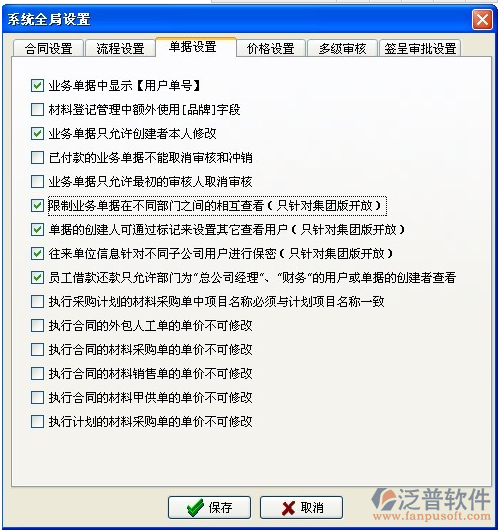 (3)材料采購單、材料銷售單、材料退貨單、外包人工單、外包機(jī)械單、運(yùn)輸車輛單、租賃結(jié)算單、其它費(fèi)用單、設(shè)備采購單、設(shè)備維修單、設(shè)備退貨單、付款申請單、付款單、收款單 (涉及財務(wù)的這14個單據(jù)) 對于【財務(wù)部】也不受該條件限制,可以查看所有部門單據(jù)。