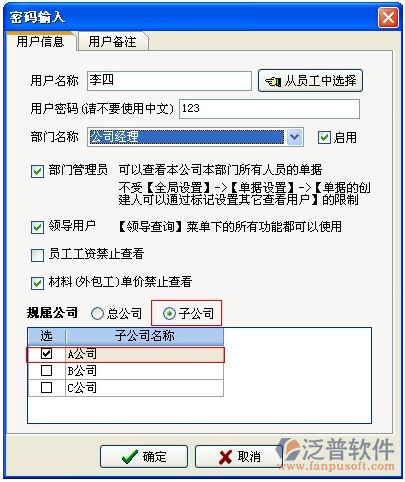 如上圖:李四規(guī)屬于A公司,是【公司經(jīng)理】可以看到A公司的所有部門、所有授權(quán)項目有關(guān)的單據(jù)。