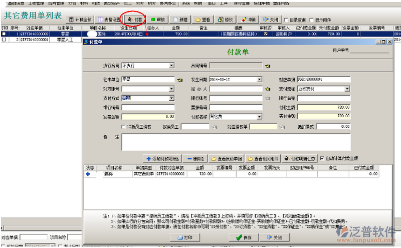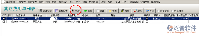 選中單據(jù)點(diǎn)擊付款,選擇支付方式,點(diǎn)保存。項(xiàng)目開拓中可以查看到該投標(biāo)項(xiàng)目發(fā)生的費(fèi)用