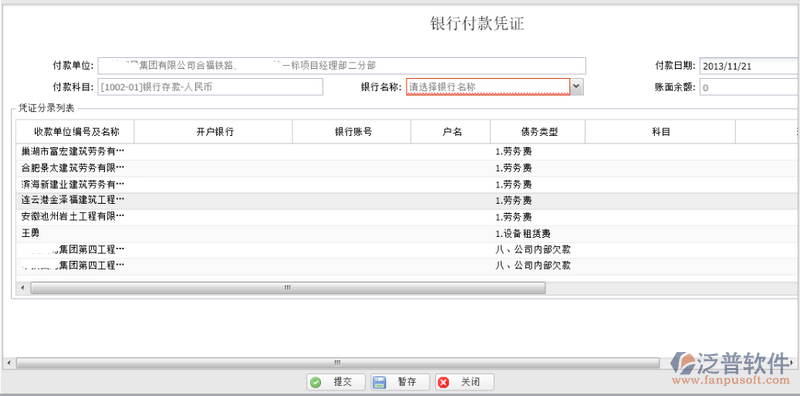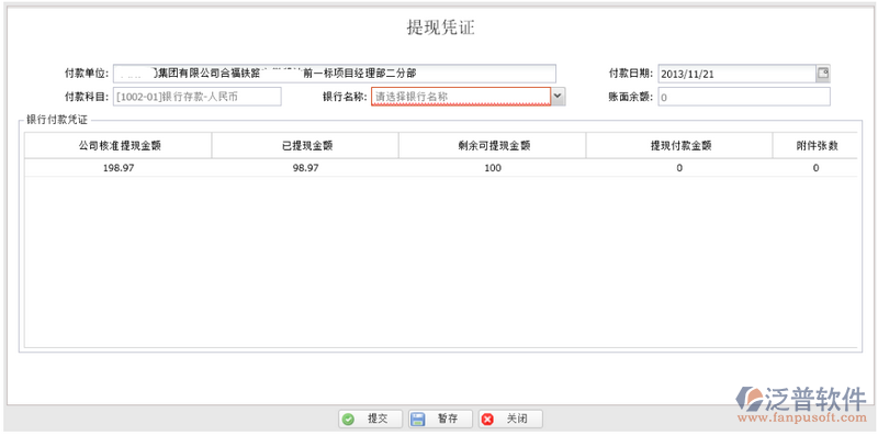 1. 銀行名稱:選擇待付款的銀行名稱,賬面余額欄會(huì)自動(dòng)獲取選擇銀行的余額;