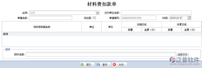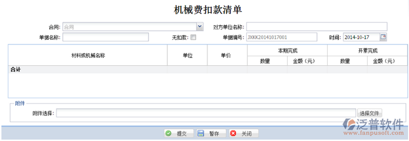 4. 無扣款:當(dāng)合同無材料費(fèi)扣款時(shí)勾選,勾選后,流程走完后機(jī)械扣款金額自動(dòng)取0;明細(xì)表中不可添加機(jī)械扣款。