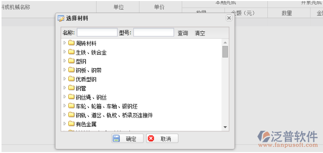選擇其中的【新增物資】菜單項(xiàng)。系統(tǒng)彈出“選擇材料”對(duì)話框,如下圖: