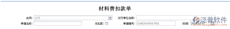 點(diǎn)擊功能菜單【成本管理—勞務(wù)管理—勞務(wù)結(jié)算—材料扣款單】,成功發(fā)起【材料費(fèi)扣款清單】流程后,加載出“材料費(fèi)扣款單”,如下圖所示:
