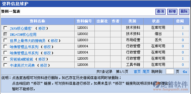 只有當(dāng)資料沒(méi)有被任何員工借閱過(guò)時(shí),資料信息才可以進(jìn)行刪除。用戶如需刪除已有的資料信息,可在資料信息列表頁(yè)面中,點(diǎn)選“資料序號(hào)”下的復(fù)選框(可多選),點(diǎn)擊“資料刪除”按鈕,經(jīng)確認(rèn)后系統(tǒng)即刪除被選中的資料信息。