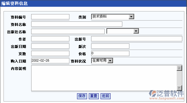 資料采購(gòu)?fù)瓿珊?,?yīng)及時(shí)由單位的指定人員進(jìn)行資料信息入庫(kù)登記??刹樵儭⑿略?、刪除資料。