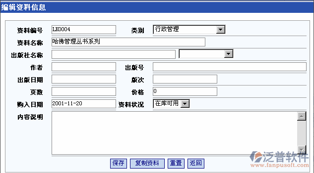在資料編輯修改頁(yè)面,點(diǎn)擊‘復(fù)制資料’按鈕,系統(tǒng)將自動(dòng)生成一個(gè)當(dāng)前資料的信息,這樣可以大大減少多本相同資料的錄入工作。