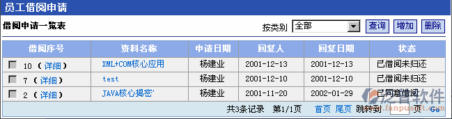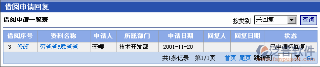 點(diǎn)擊“借閱回復(fù)”菜單進(jìn)入“借閱申請(qǐng)回復(fù)”頁(yè)面。頁(yè)面將顯示所有員工的資料借閱申請(qǐng)信息。用戶可按類別顯示借閱申請(qǐng)信息。