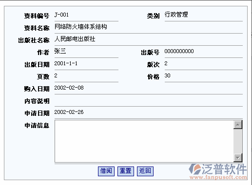 用戶需選擇借閱的資料,在資料序號(hào)中點(diǎn)擊相應(yīng)的單選鈕(只能單選),某些資料的單選鈕為灰色,表示該資料已被其他人借閱,此時(shí)不能再進(jìn)行借閱。然后點(diǎn)擊“借閱”按鈕進(jìn)入“資料申請(qǐng)借閱”頁(yè)面。“資料申請(qǐng)借閱”頁(yè)面將顯示員工申請(qǐng)借閱的資料的主要信息,用戶應(yīng)對(duì)申請(qǐng)所需項(xiàng)目“申請(qǐng)信息”進(jìn)行認(rèn)真填寫,完成后點(diǎn)擊“提交申請(qǐng)”按鈕進(jìn)行信息保存。點(diǎn)擊“重置”按鈕可清除掉用戶填寫的所有信息。點(diǎn)擊“返回”按鈕則放棄本次借閱申請(qǐng),直接返回資料查詢頁(yè)面。