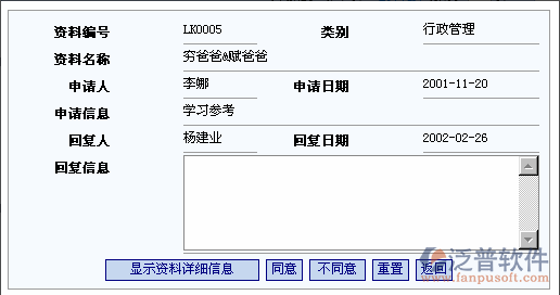 回復(fù)員工的借閱申請(qǐng)時(shí),點(diǎn)擊相應(yīng)的申請(qǐng)序號(hào)鏈接,進(jìn)入資料申請(qǐng)回復(fù)頁(yè)面。