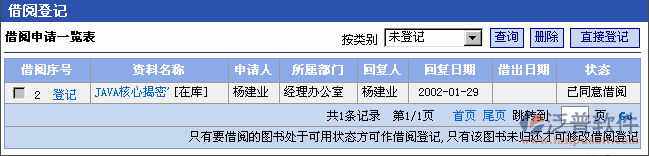 點(diǎn)擊“借閱登記”菜單,進(jìn)入“借閱登記管理”列表頁(yè)面。頁(yè)面將列出公司所有的資料借閱信息和經(jīng)回復(fù)的借閱申請(qǐng)信息。用戶也可按照登記類別進(jìn)行查詢。