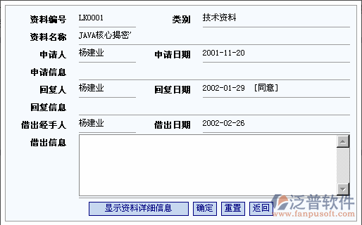 只有員工的資料管理借閱申請(qǐng)經(jīng)回復(fù)批準(zhǔn)后才可以借閱相應(yīng)的資料,因此需及時(shí)地登記員工的借閱信息。