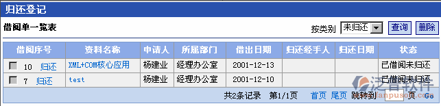 點(diǎn)擊“歸還登記”菜單,進(jìn)入資料歸還頁(yè)面。頁(yè)面中顯示公司當(dāng)月的所有已借閱的資料借閱信息列表。用戶也可按照歸還類別對(duì)借閱信息進(jìn)行查詢。
