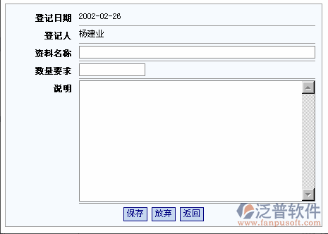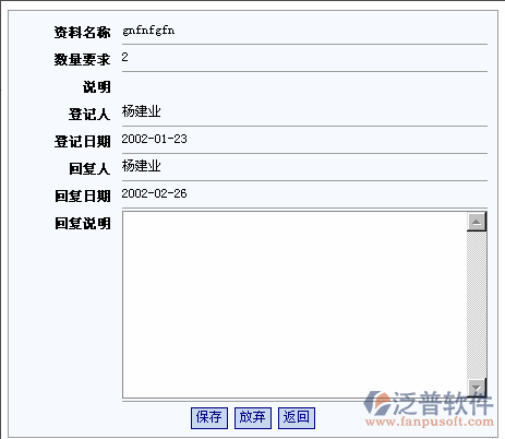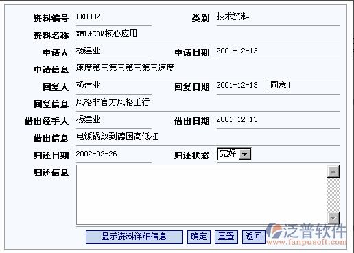 員工使用資料結(jié)束進(jìn)行資料歸還時(shí),應(yīng)及時(shí)進(jìn)行資料的歸還登記。