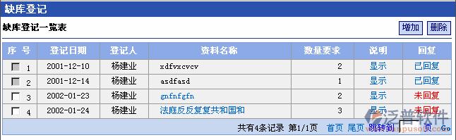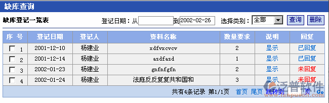 點(diǎn)擊[已回復(fù)]顯示指定缺庫(kù)登記的回復(fù)信息。