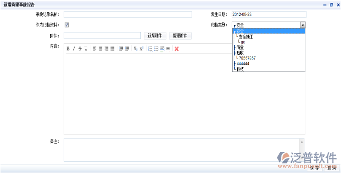 如圖-<質(zhì)量事故記錄.瀏覽>,默認(rèn)為項(xiàng)目樹(shù)第一項(xiàng),選中項(xiàng)目,點(diǎn)擊“新增”,出現(xiàn)如下圖所示界面: