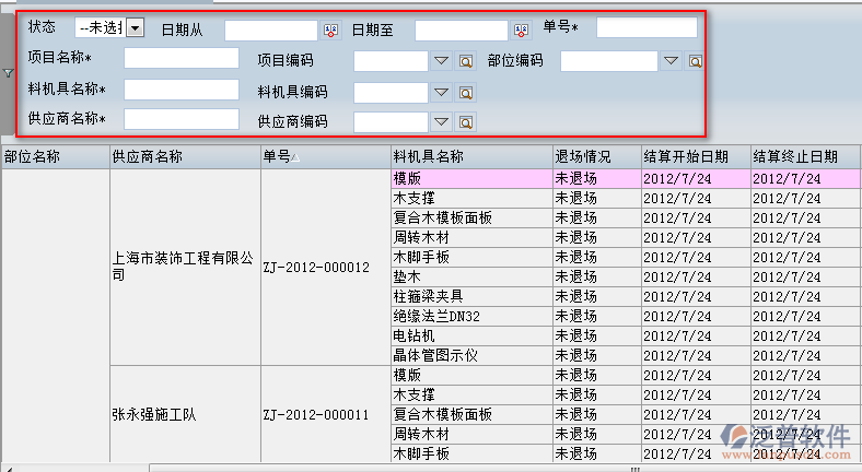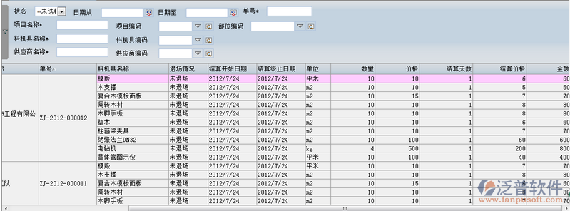 2、在主界面中,系統(tǒng)為用戶提供檢索條件查詢功能。企業(yè)可通過:狀態(tài)、項目名稱、料機(jī)具名稱、供應(yīng)商名稱等相關(guān)信息進(jìn)行檢索。如圖: