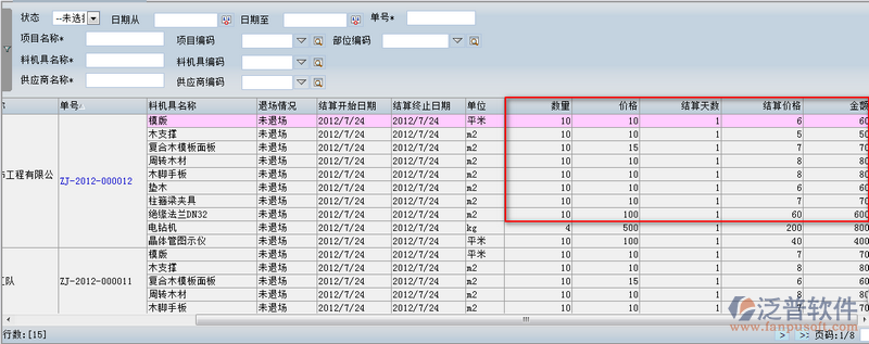 3、在租賃結(jié)算統(tǒng)計表中可看到設(shè)備的數(shù)量、價格、結(jié)算天數(shù)、結(jié)算價格以及總金額。如圖: