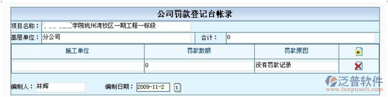 工程質(zhì)量罰款單,登記界面如下圖所示: