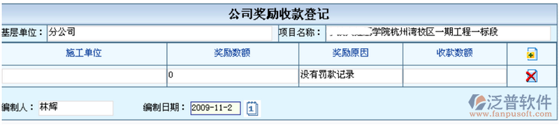 工程質(zhì)量獎(jiǎng)勵(lì)收款,登記界面如下圖所示: