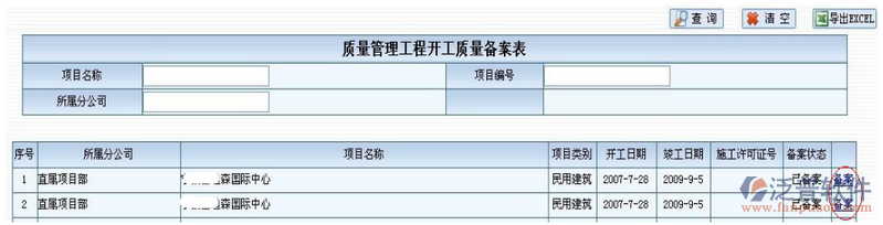 工程開工質(zhì)量備案,首先進(jìn)入的界面如(圖1)所示,點擊紅色圈中的“備案”鏈接進(jìn)行備案記錄界面,如(圖2)所示。