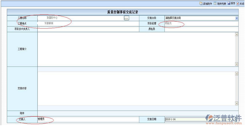 工程質(zhì)量預(yù)控交底,登記界面如下圖所示,紅色圈圈中的地方為系統(tǒng)自動帶過來的記錄。