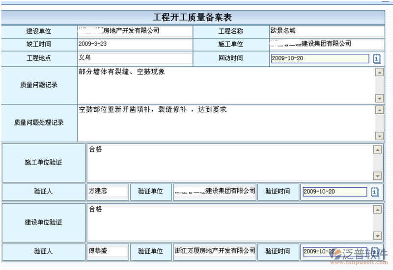 工程質(zhì)量回訪記錄:本模塊記錄工程質(zhì)量問題以及質(zhì)量問題處理記錄情況。界面如下圖示: