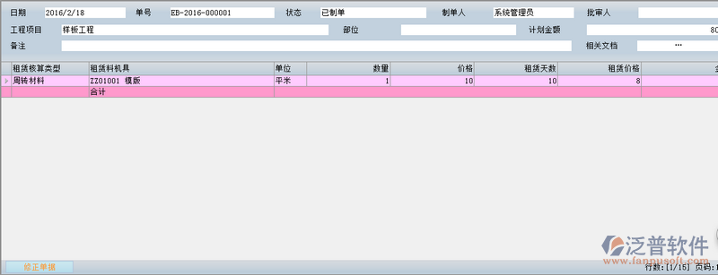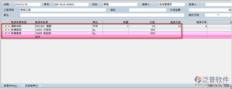 填寫完租賃設(shè)備計(jì)劃中的相關(guān)信息,便可創(chuàng)建新的租賃設(shè)備計(jì)劃。如圖: