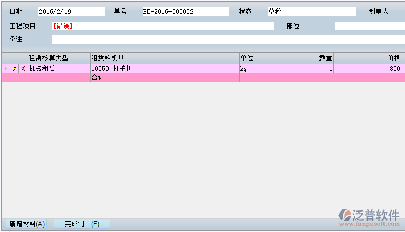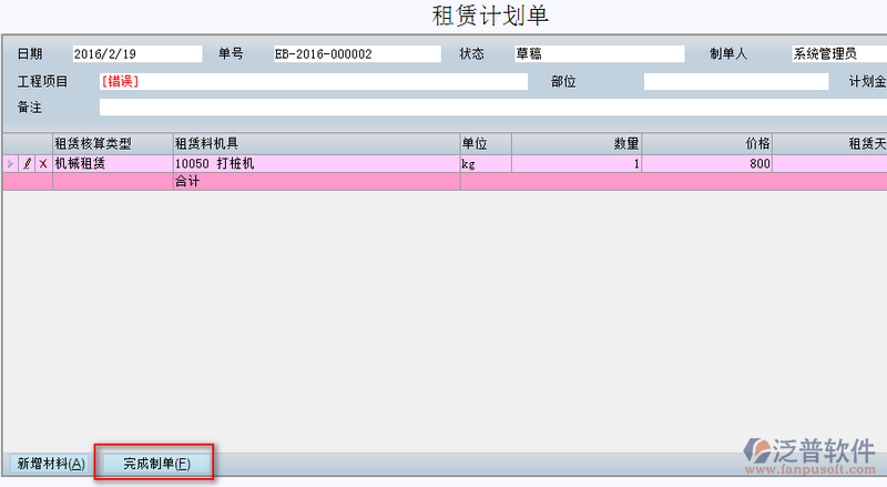 填寫完整的租賃計(jì)劃可直接點(diǎn)擊【完成制單】即可完成。如圖: