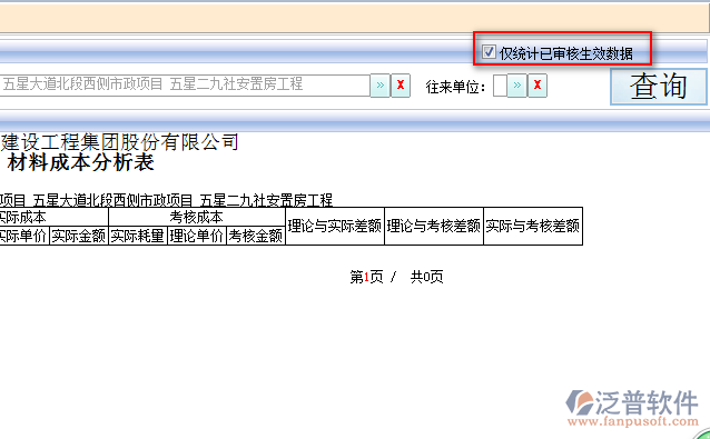 4、材料成本分析表可根據(jù)需求選擇進(jìn)行顯示,可只統(tǒng)計已經(jīng)審核生效的數(shù)據(jù)或者將正在審核的數(shù)據(jù)一起統(tǒng)計到系統(tǒng)中,如圖: