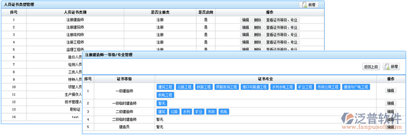 證書類型管理分為企業(yè)證書類型和人員證書類型兩種,可以分別進(jìn)行設(shè)置。系統(tǒng)初始設(shè)置了常用的證書類型、專業(yè)信息,根據(jù)用戶的使用習(xí)慣,后期也可以自由添加和編輯。
