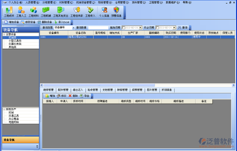 機械設(shè)備是企業(yè)重要的資產(chǎn),如何有效的利用企業(yè)這個資產(chǎn),直接影響著企業(yè)的經(jīng)濟效益,本系統(tǒng)可以幫助企業(yè)對固定資產(chǎn)、自購機械、租賃機械的進行一體化管理,通過信息化實現(xiàn)資產(chǎn)的有效使用及利用;對于自購機械系統(tǒng)提供全程計劃、采購及使用管理;租賃管理可以滿足對租賃機械使用及費用計算要求。