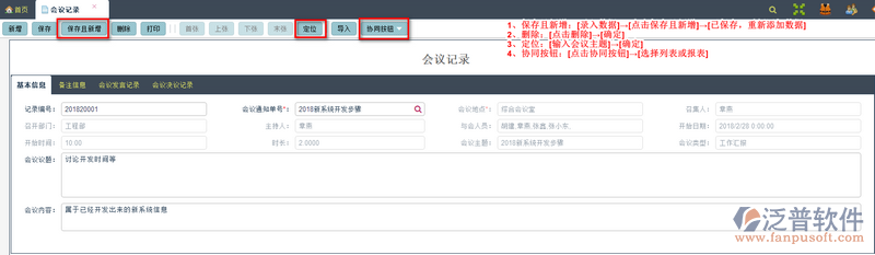 (1)、【錄入數(shù)據(jù)】→【保存】:錄入記錄編號(hào)、會(huì)議通知單號(hào)、會(huì)議地點(diǎn)、召集人、召開(kāi)部門(mén)、主持人、與會(huì)人員、開(kāi)始日期、開(kāi)始時(shí)間、時(shí)長(zhǎng)、會(huì)議主題、會(huì)議類(lèi)型、會(huì)議議題、會(huì)議內(nèi)容、通知人、通知時(shí)間、記錄人、記錄時(shí)間、備注等以上信息,并上傳相關(guān)的附件